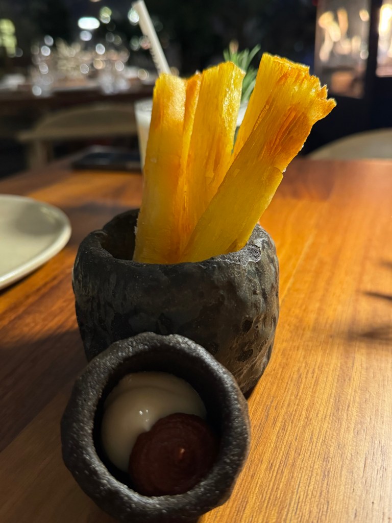 We opted to eat at the rooftop restaurant on our first night, largely because we were tired from travel. We ordered several tapas dishes and were delighted by the bartender, who crafted excellent mocktails for us — no afterthought drinks here. The rooftop views would have been lovely under clearer skies, but even with the stormy weather, the experience felt relaxed and easy.