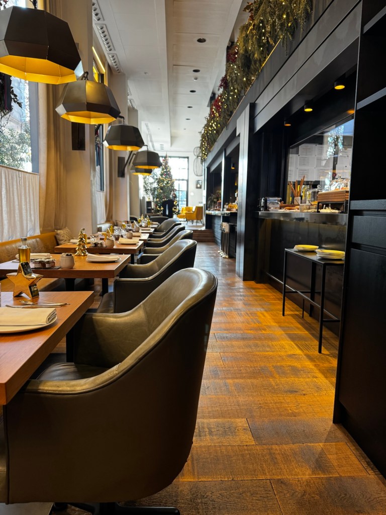 Breakfast was served just off the lobby each morning and was included thanks to our Fora benefits. All drinks, including barista-made coffees, were complimentary. There was a small buffet paired with à la carte options, and because the hotel has only around 50 rooms, the buffet offerings were modest but constantly refreshed. This was the opposite of a typical large-chain breakfast where food sits out for hours — everything here felt fresh and cared for.