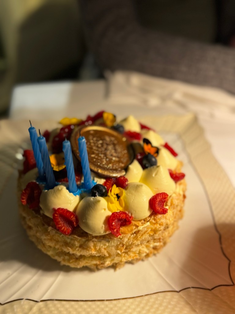 The owner—who somehow remembered us—offered complimentary dessert and drinks. We declined (we don’t drink, and I knew more dessert was coming). He insisted.